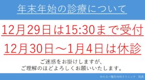 急に寒くなってきましたが、皆様体調にお変わりございませんでしょうか。 久しぶりの投稿となりますが、この2か月間も多くの患者さまにお越しいただいております。あらためて感謝申し上げます、ありがとうございます。 さて、年末年始 […]